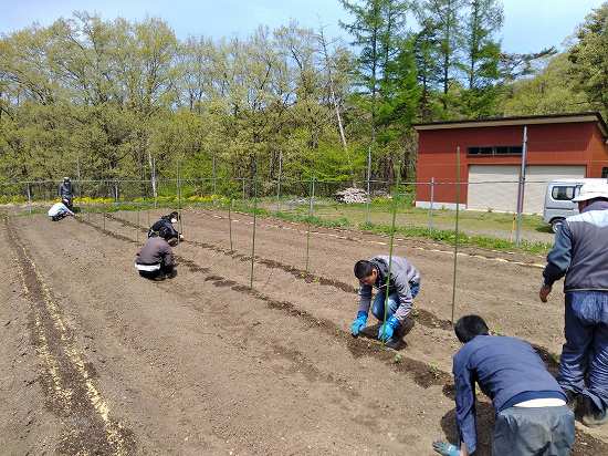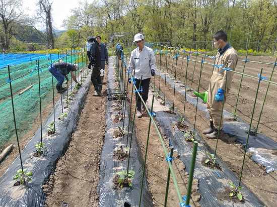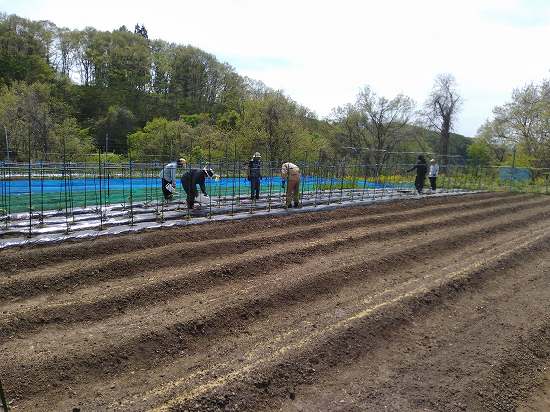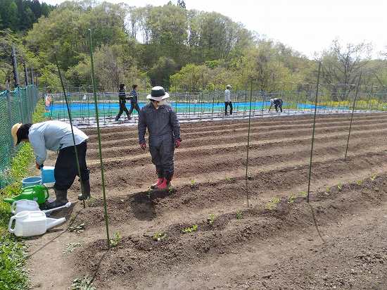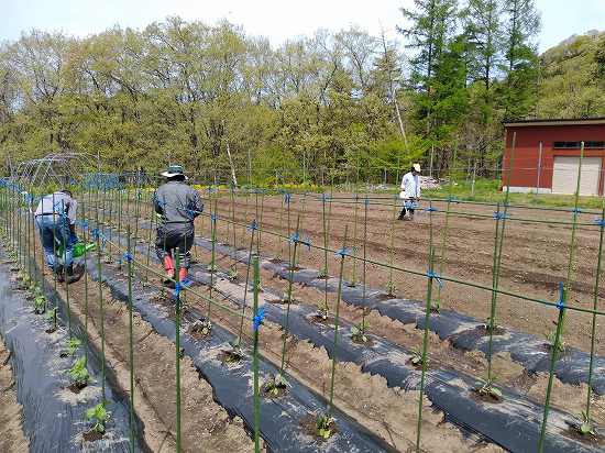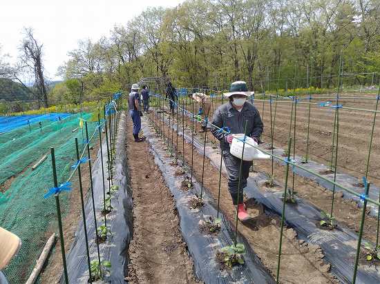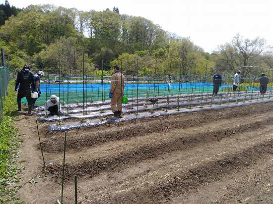 午後は水やりの続き&キヌサヤ補充定植、キュウリのネット張りを行いました(^O^)/